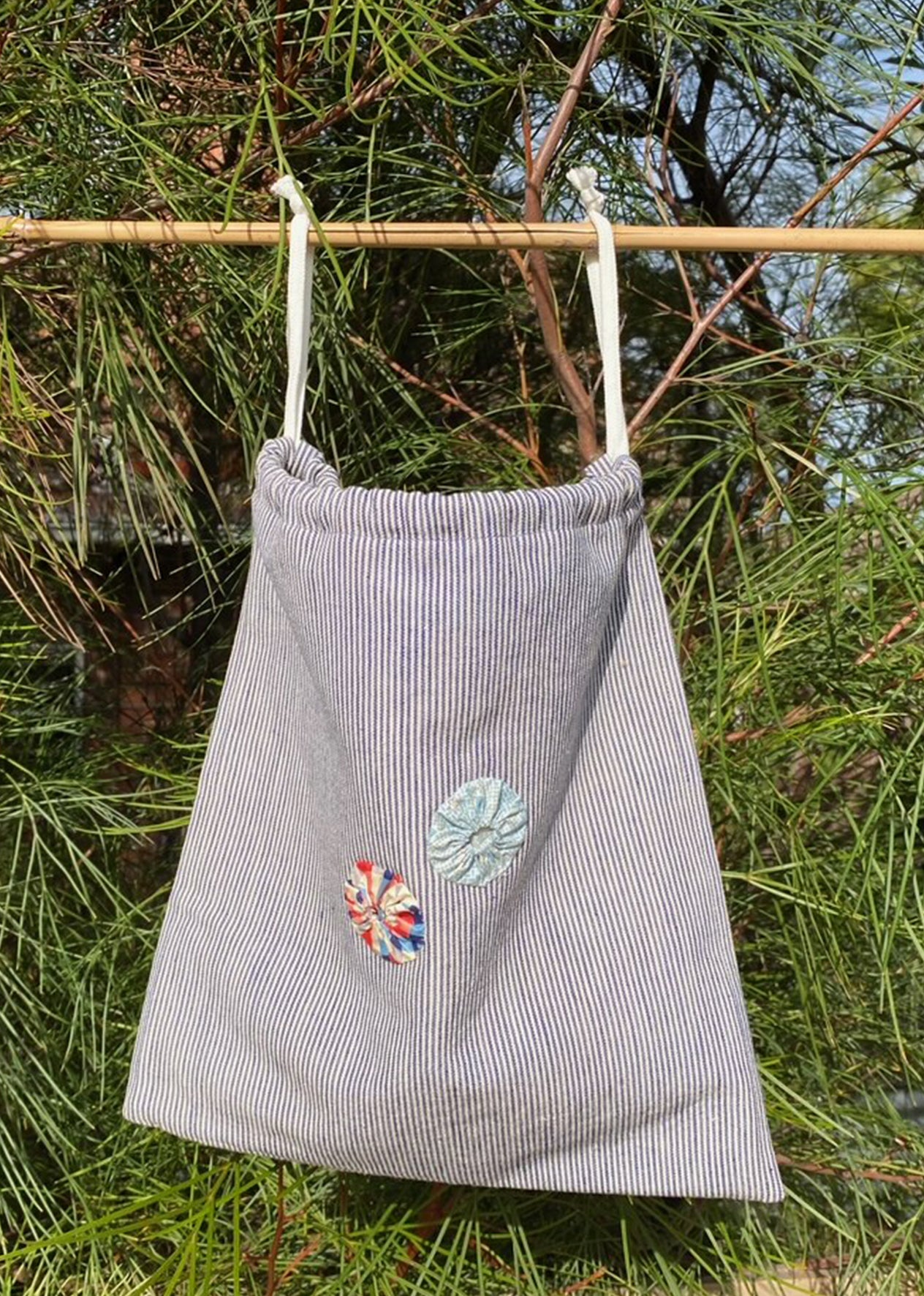 Carry your sleepwear in one of these beautiful cotton drawstring bags. The 29x32cm bags are machine pieced, using French seams and hand embellished; made using up-cycled fabrics.